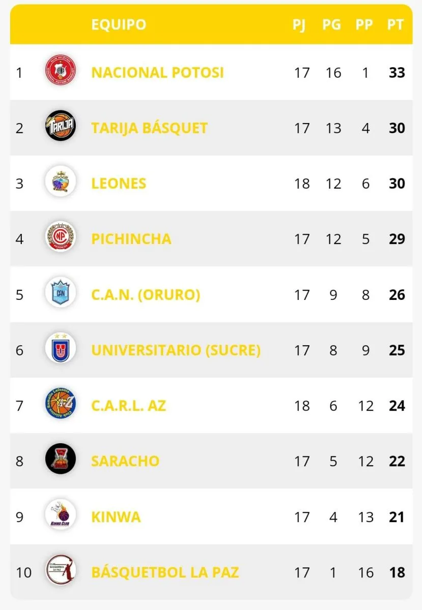 “Su pase se dio con los puntos que sumó al perder en sus dos más recientes encuentros contra Nacional Potosí (83-93, por la fecha 17) y Leones (82-55, 18) porque llegó a los 24 puntos, que son inalcanzables por los dos últimos”, informó la Federación Boliviana de Básquetbol (FBB) en una nota de prensa.
