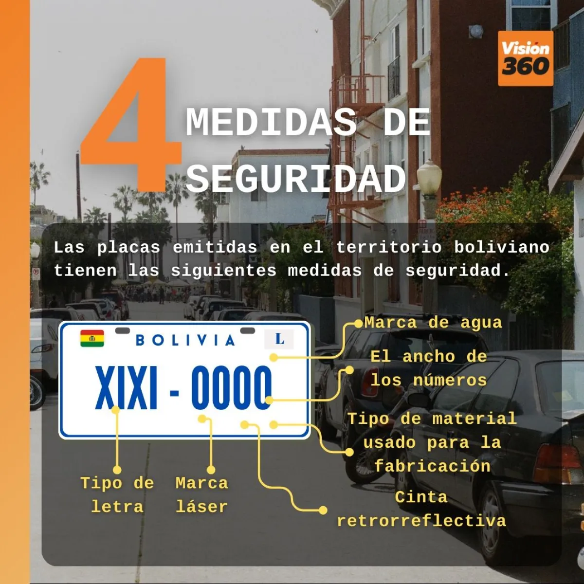 Las placas emitidas en el territorio boliviano tienen diferentes medidas de seguridad. Entre ellas están: la marca de agua, el ancho de los números, el tipo de letras, el material utilizado para su fabricación, la cinta brillosa retrorreflectiva y una marca láser. Si nota alguna irregularidad puede ser que la placa sea falsa.