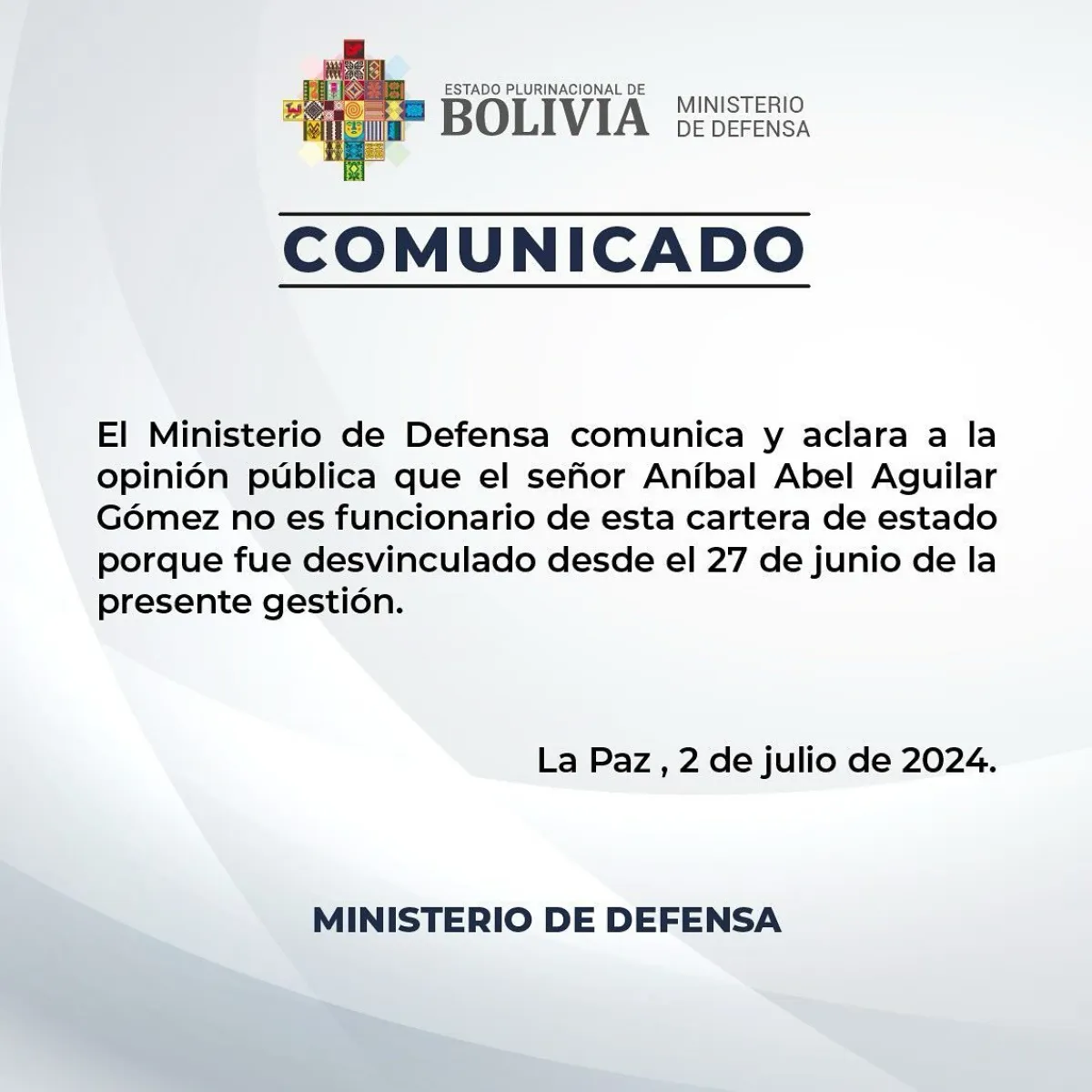 “El Ministerio de Defensa comunica y aclara a la opinión pública que el señor Aníbal Abel Aguilar Gómez no es funcionario de esta cartera de Estado porque fue desvinculado desde el 27 de junio de la presente gestión”, dice el breve pronunciamiento.