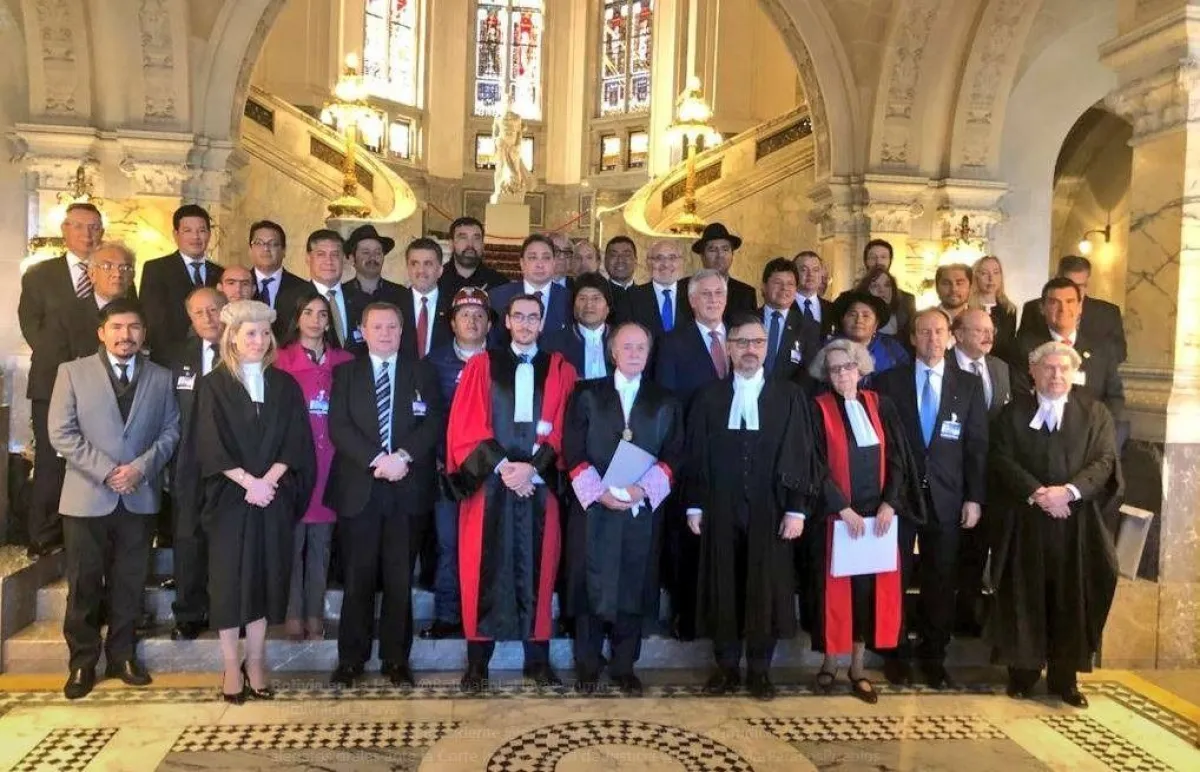El entonces presidente Morales junto con el equipo jurídico nacional e internacional en La Haya, excancilleres y expresidentes, en 2018. Foto: Cancillería de Bolivia