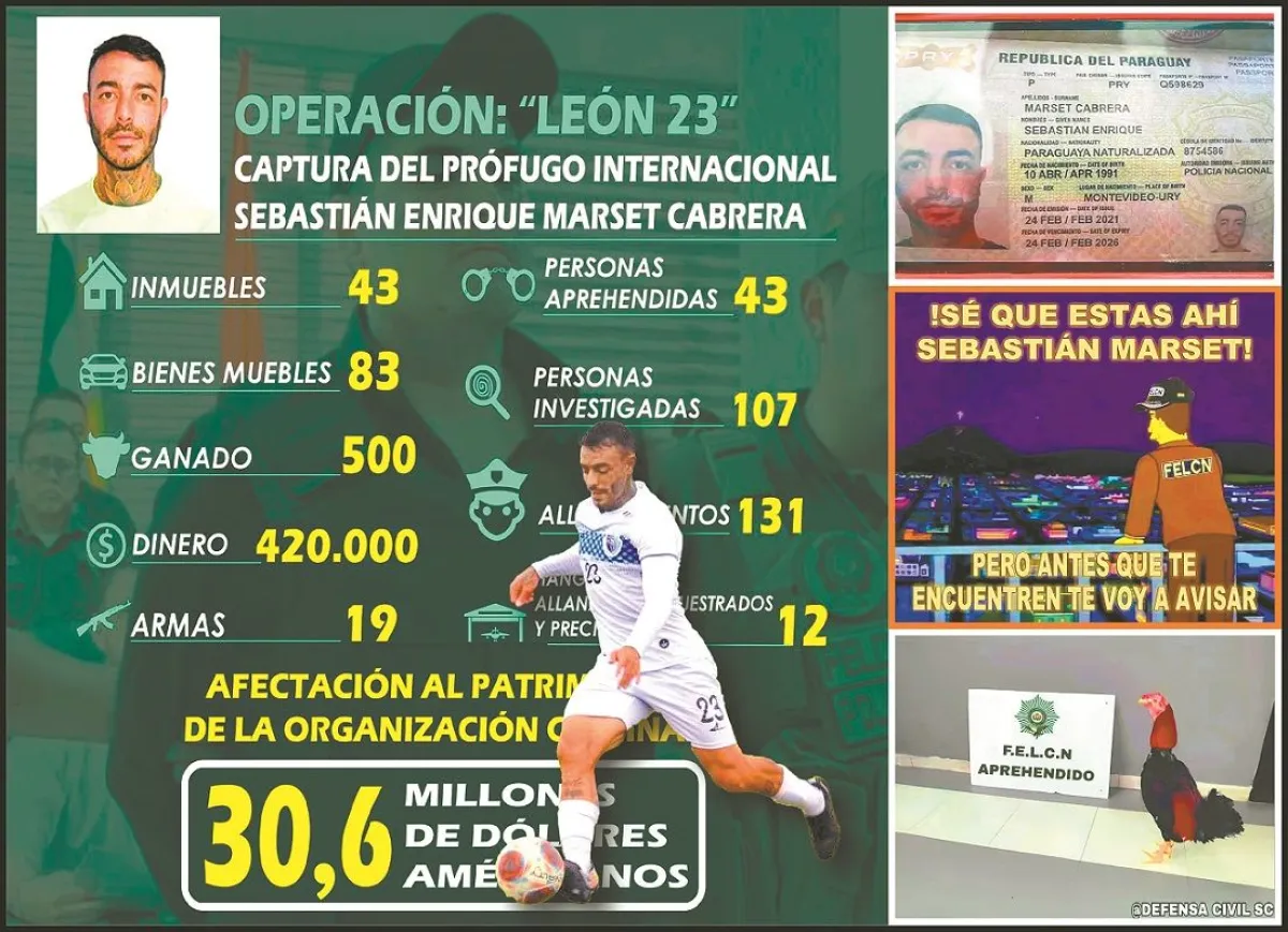 En Bolivia, además de un rastro financiero que involucró a 107 personas, de las cuales 43 fueron aprehendidas en los primeros meses, entre testaferros y personal de seguridad, el caso del supuesto futbolista “brasileño” y “empresario” de 32 años generó 131 allanamientos, 12 hangares de avionetas intervenidos, 19 armas secuestradas, 500 cabezas de ganado secuestradas, 83 vehículos precintados de diferentes tipos y marcas, 43 inmuebles incautados y 420 mil dólares retenidos en efectivo, lo que suma una afectación al patrimonio del extranjero de 30,6 millones de dólares.