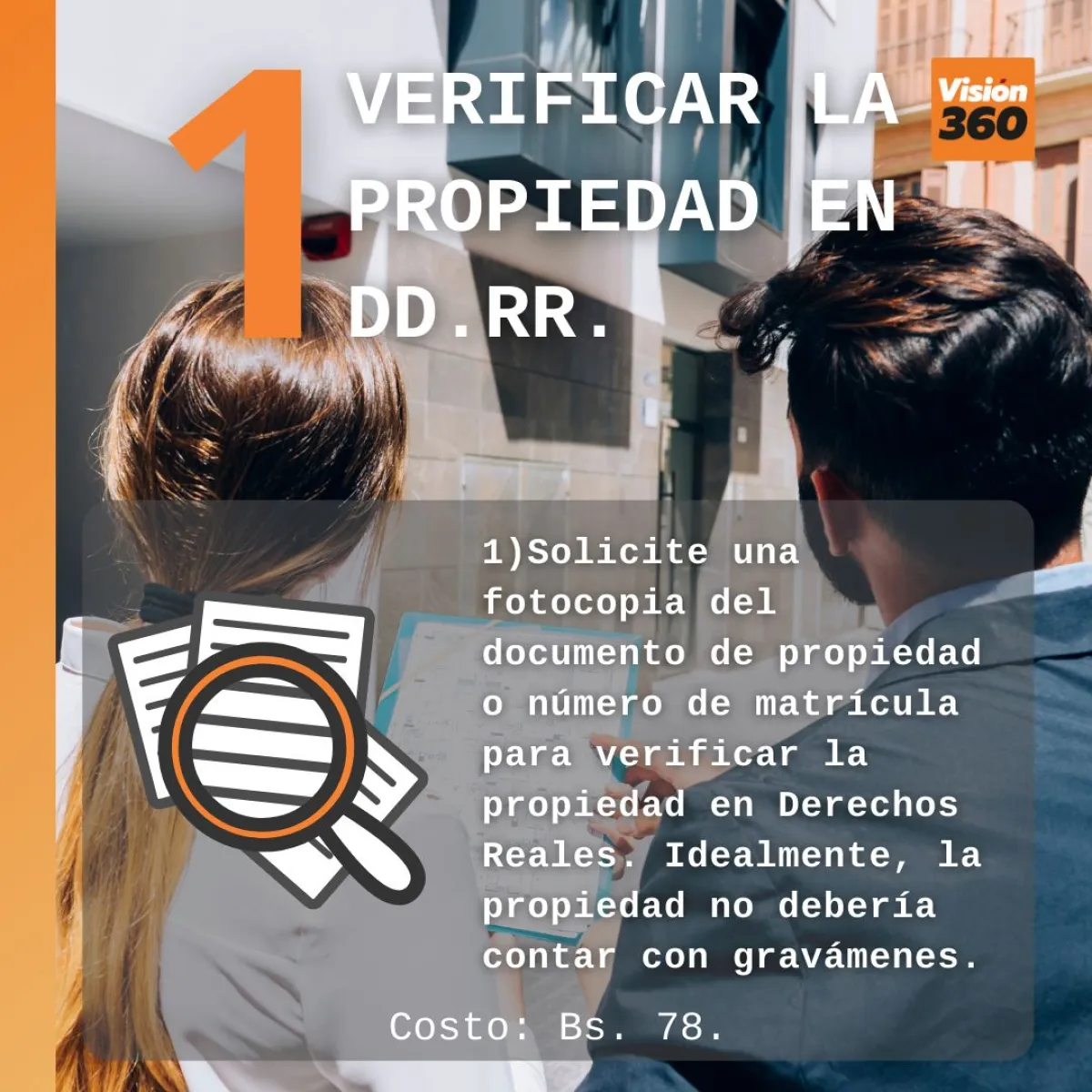 • Cuando ya se tiene identificado el inmueble, debe solicitarse, a la persona que desea rentar, una fotocopia del documento de propiedad o, en su defecto, el número de matrícula para hacer la verificación en Derechos Reales (DDRR), mediante una información rápida, cuyo costo es de 78 bolivianos, si evidentemente la vivienda figura a su nombre. Lo óptimo es que este documento se lo tramite en el mismo día de la firma del contrato.