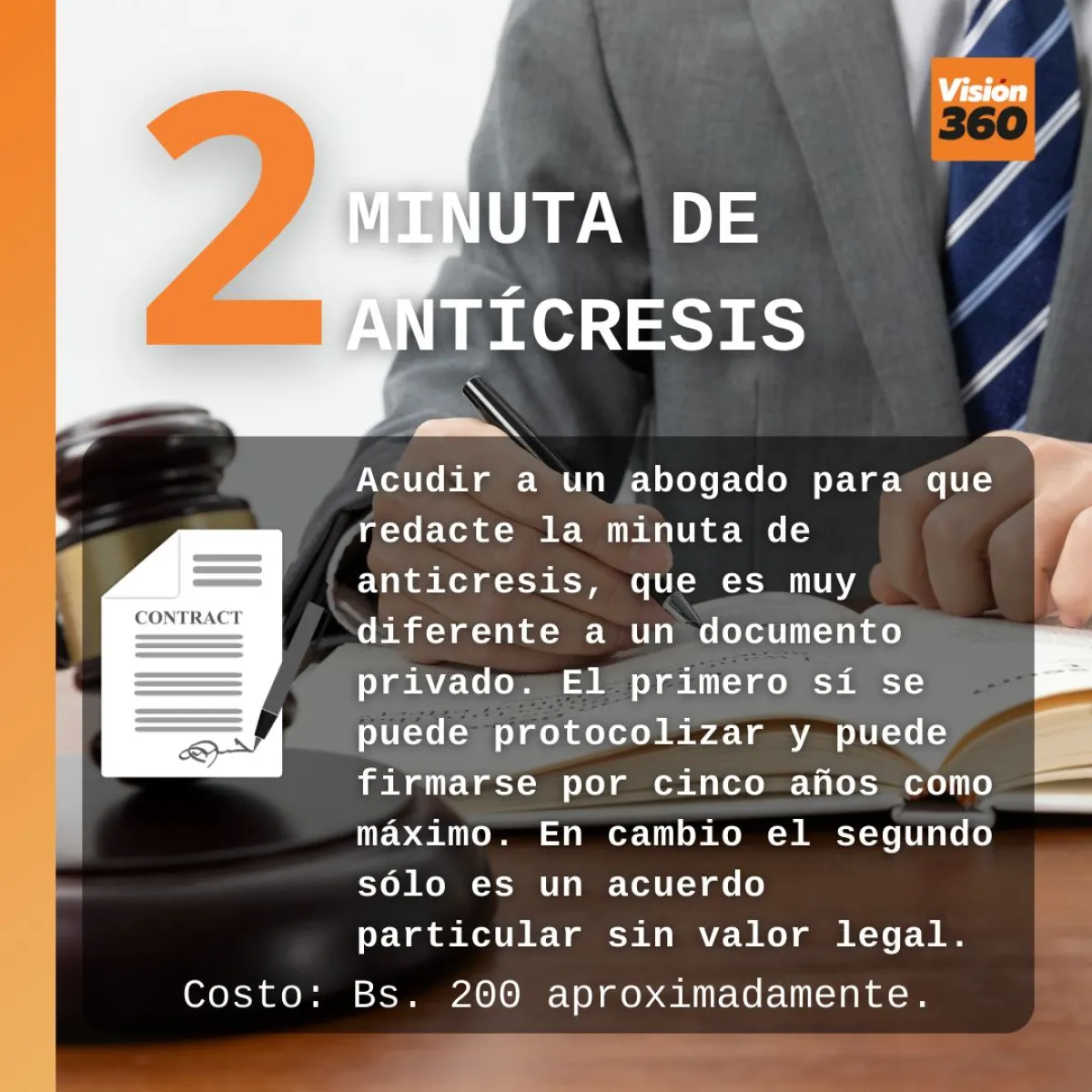 • El siguiente paso es acudir donde un abogado para que redacte la minuta de anticresis, que es muy diferente de un documento privado que se solía suscribir, porque el primero sí se puede protocolizar; pero el segundo sólo es un acuerdo particular sin valor legal.