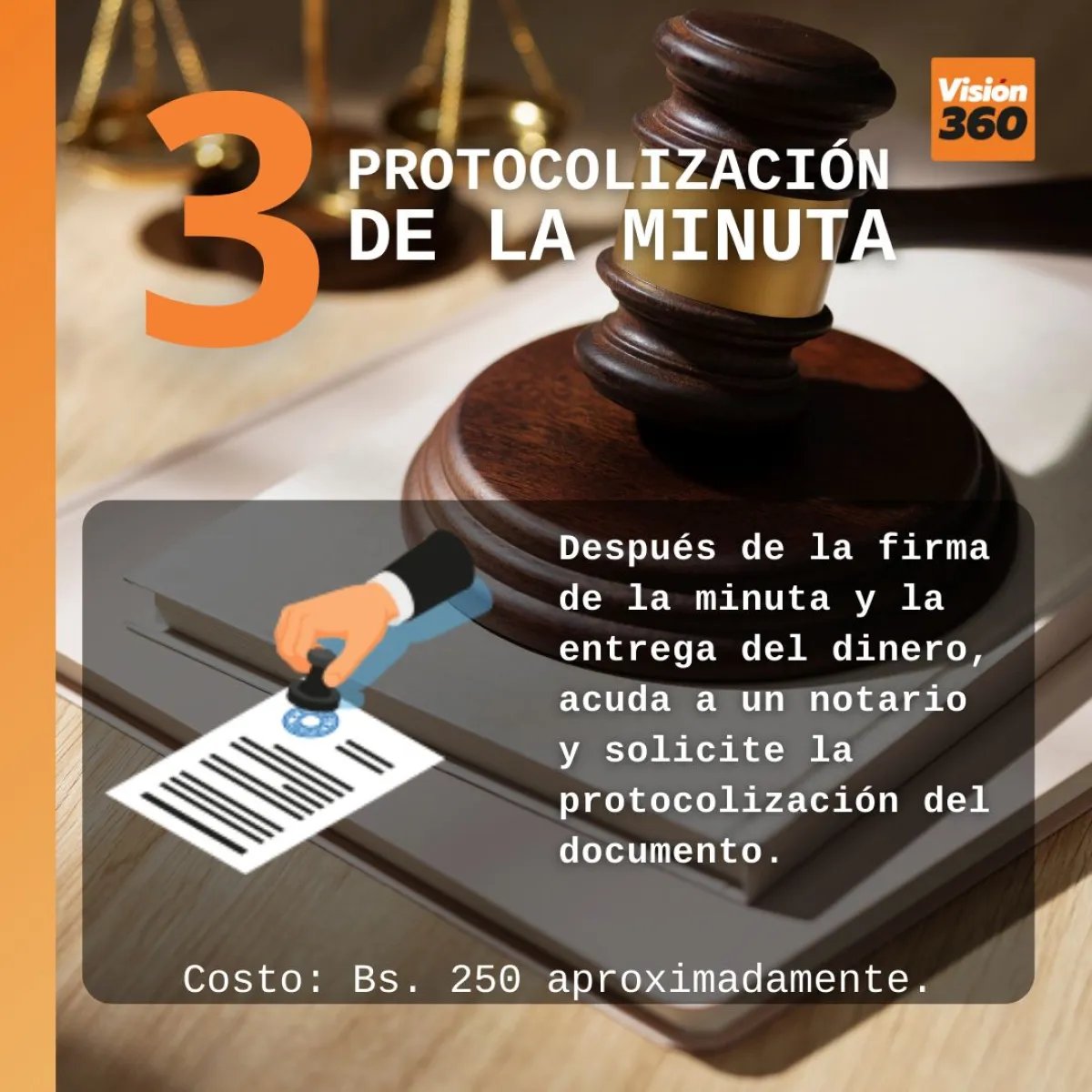 • Después de la firma de la minuta y la entrega del dinero, se acude  a un notario para solicitar que protocolice el documento, acto que es considerado solemne, porque se trata de convertir un documento privado, entre particulares, en una escritura pública. En promedio, el honorario que cobra el profesional en este caso es 250 bolivianos.
