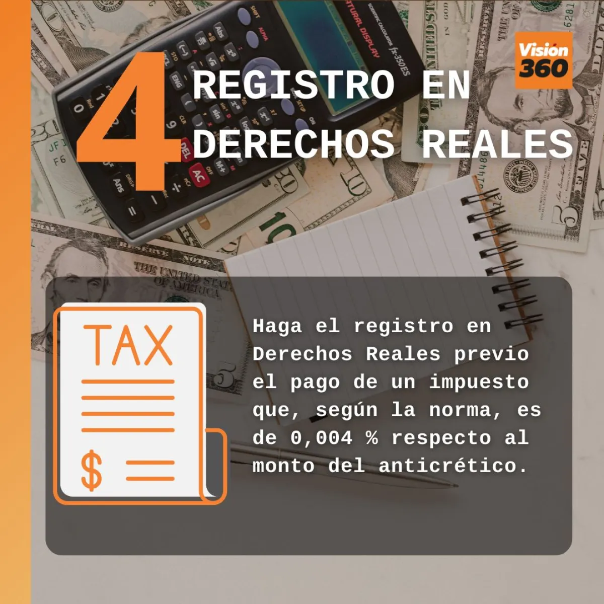 • El último paso es el registro en DDRR, previo el pago de un impuesto que, según la norma, es de 4X1.000 sobre el monto del anticrético.