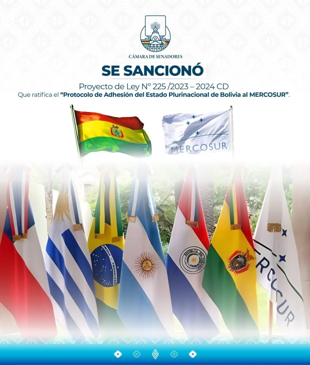La adhesión de Bolivia ya ha sido ratificada por Argentina, Uruguay, Paraguay y Brasil. Según un informe de la agencia IP de Paraguay, una vez que Bolivia haga el depósito del instrumento, se abre un plazo de 30 días para su entrada en vigor y el país tendrá un plazo de hasta cuatro años para incorporar el acervo normativo del Mercosur.