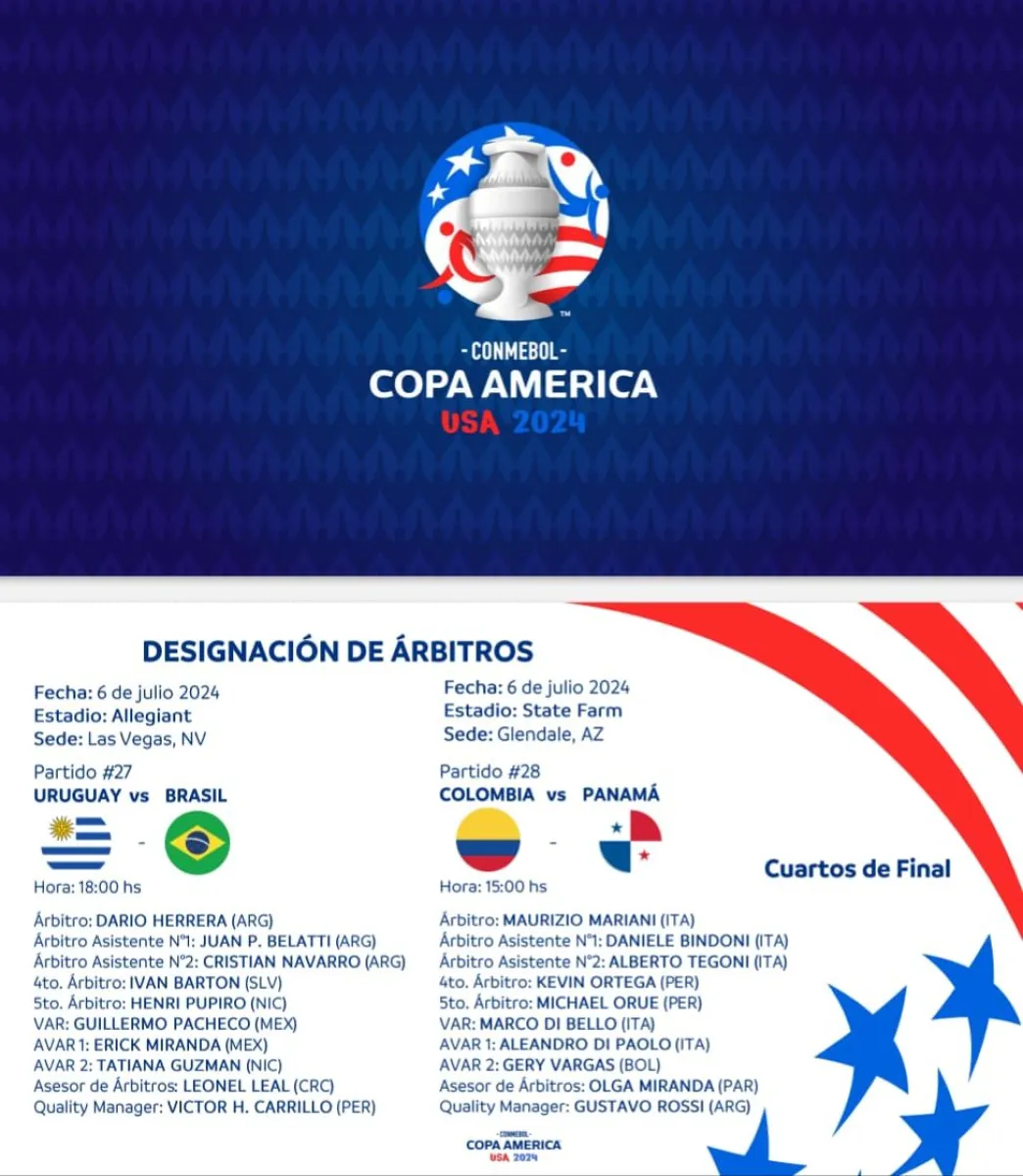 Este será el segundo partido de Vargas en la Copa América, estuvo como VAR en la terna del partido entre Perú y Canadá, por la fase de grupos.