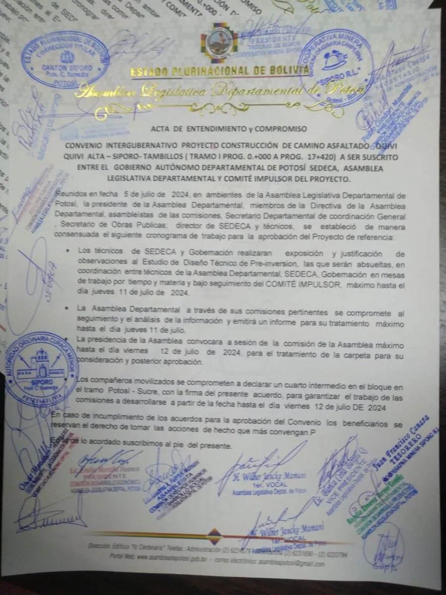 “En estos momentos se suscribe acta de entendimiento y compromiso con el comité impulsor de la carretera de Siporo, en la Asamblea Legislativa Departamental de Potosí. Tras la suscripción se declara un cuarto intermedio en el bloqueo”, declaró la asambleísta.