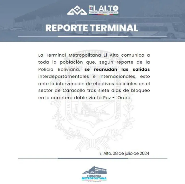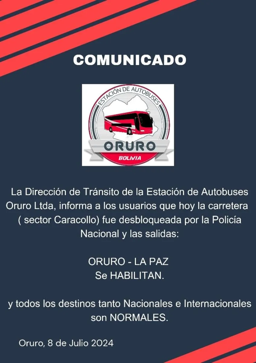 Las terminales de El Alto, Oruro y Cochabamba informaron este lunes que reanudaron los viajes con normalidad en la ruta La Paz y Oruro, una vez que la Policía desbloqueara esta mañana el sector de Caracollo, donde el paso fue interrumpido por siete días.