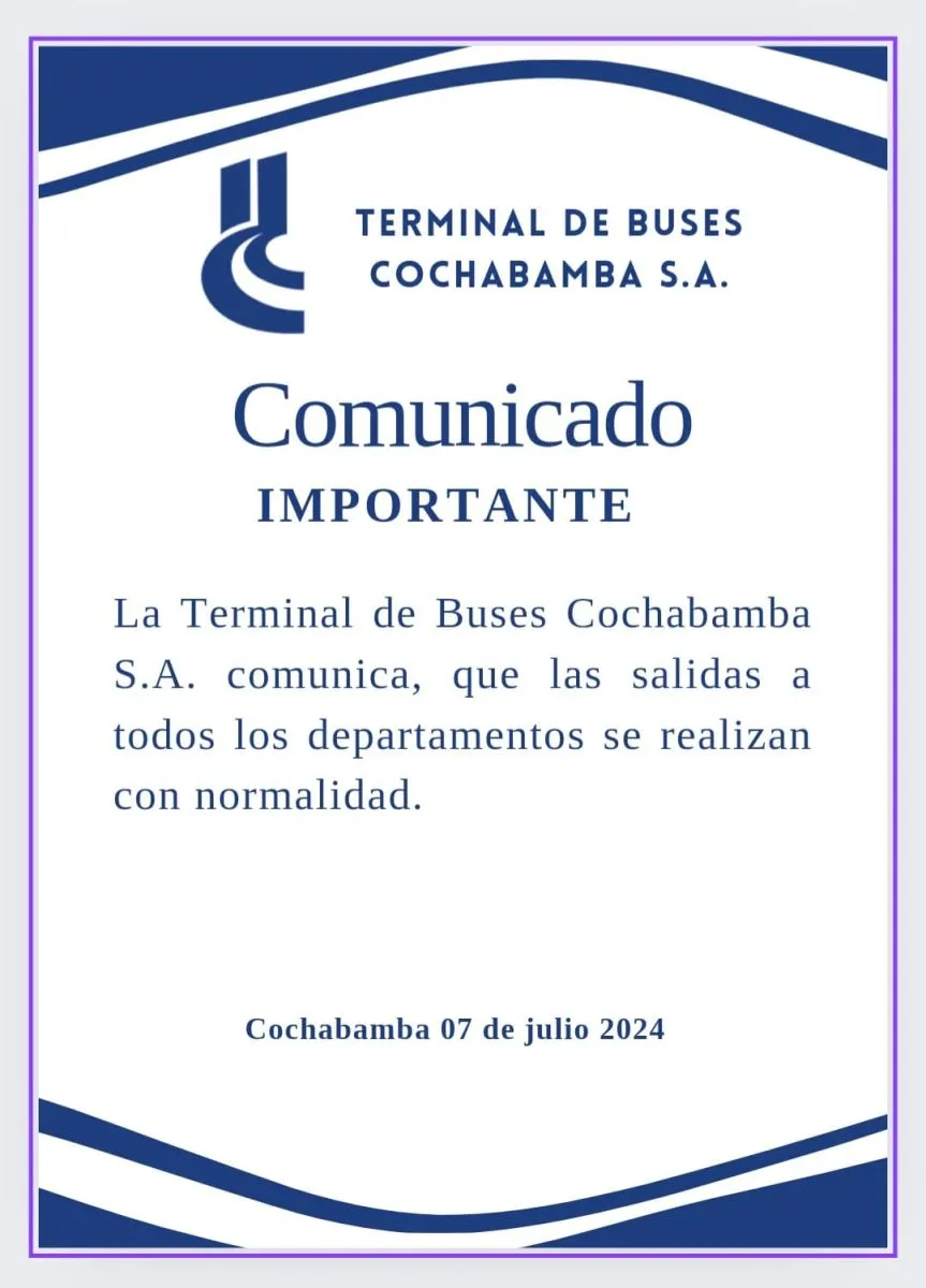 “La carretera principal hacia el occidente habilitada, las salidas a todos los departamentos se realizan con normalidad”, dice la terminal de Cochabamba en un comunicado.