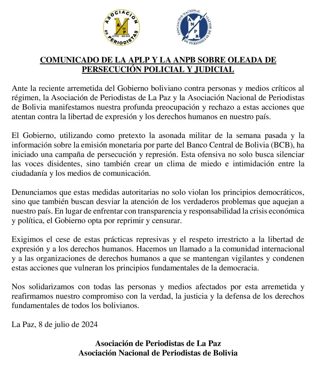 La Asociación de Periodistas de La Paz y la Asociación Nacional de Periodistas de Bolivia exigieron este lunes, mediante un comunicado, el cese de las prácticas represivas y respeto a la libertad de expresión en el país.