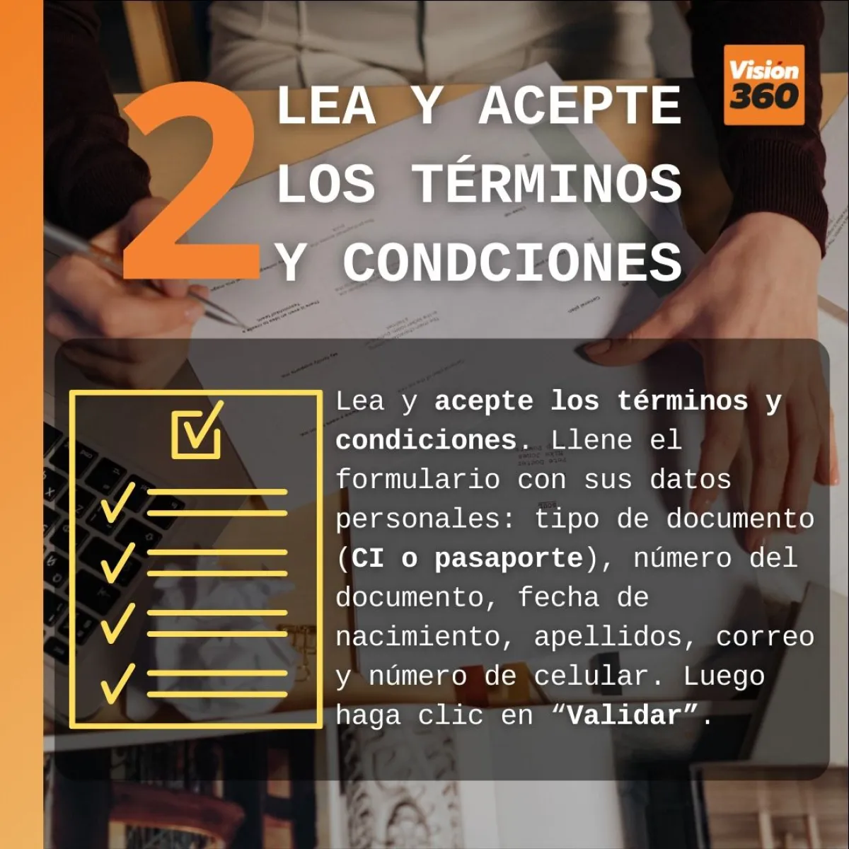 • Lea y acepte los términos y condiciones, luego haga clic en Siguiente. Llene los espacios con sus datos personales: tipo de documento (carnet de identidad o pasaporte), número del documento, fecha de nacimiento, apellidos paterno y materno, correo electrónico y número de celular. Luego, haga clic en Validar.