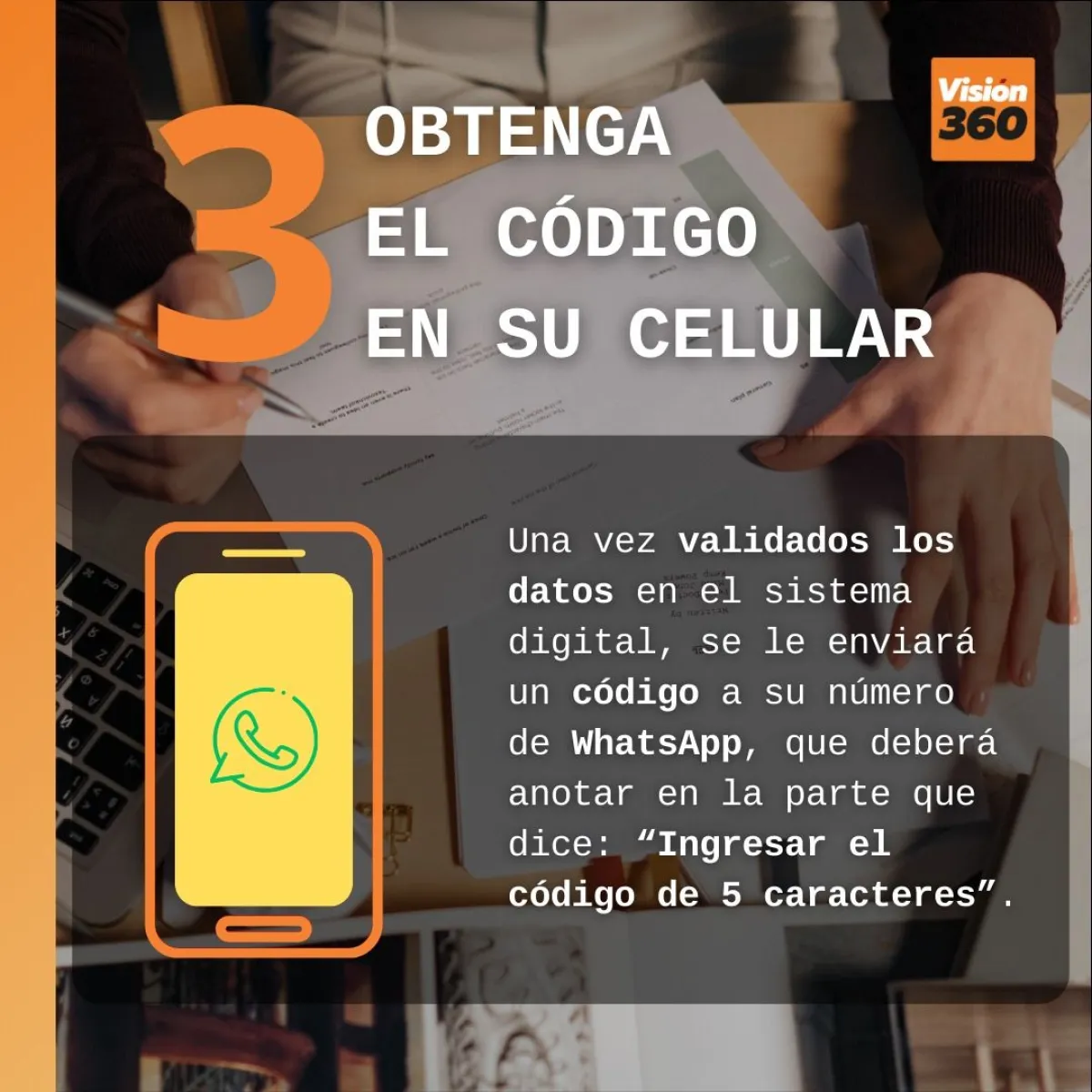 • Cuando ya estén verificados y validados los datos en el sistema digital, se le enviará un código a su número de WhatsApp, que deberá anotar en la parte señalada como “Ingresar el código de 5 caracteres”.