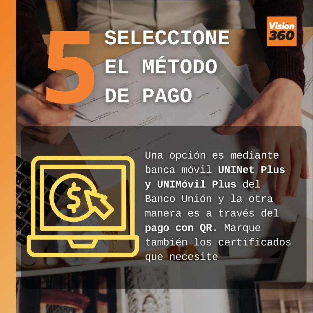 • Seleccione el método de pago. Una opción es mediante banca móvil UNINet Plus y UNIMóvil Plus del Banco Unión y la otra manera es a través del pago con QR. Marque también los certificados que necesite.