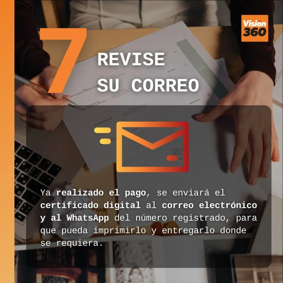 • Ya realizado el pago, se enviará el certificado digital al correo electrónico y al WhatsApp del número registrado para que pueda imprimirlo y entregarlo donde se requiera.