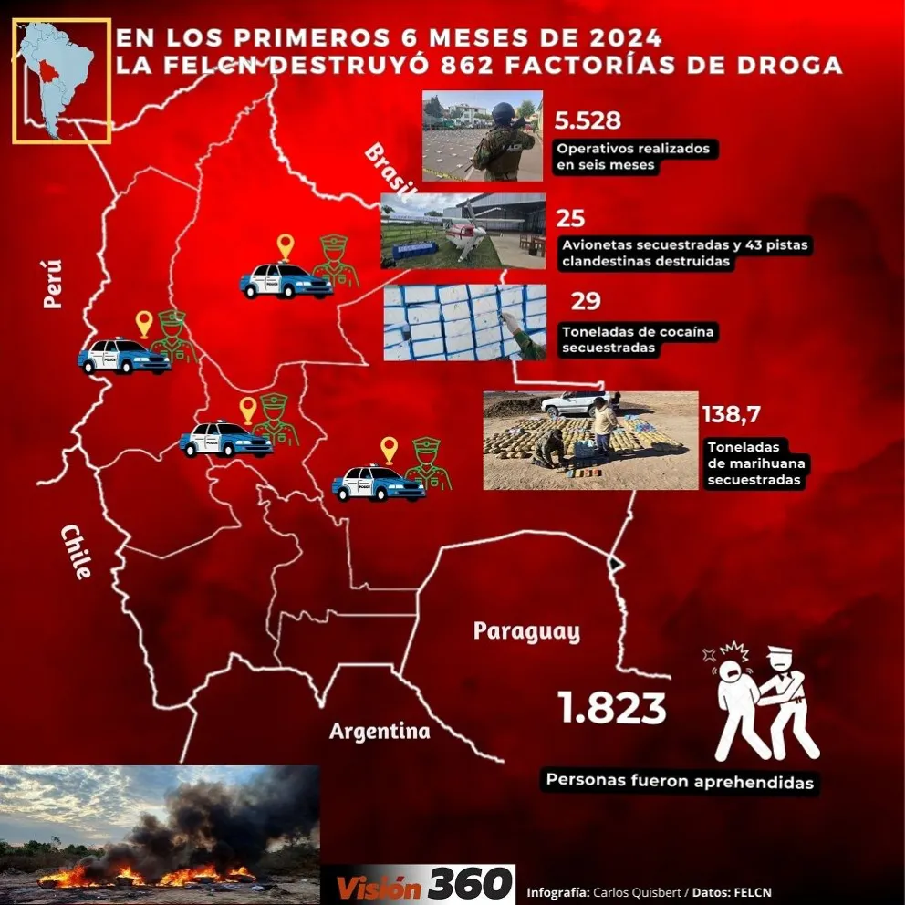 De enero a junio de 2024, la Fuerza Especial de Lucha Contra el Narcotráfico (Felcn) realizó 5.528 operativos, en los que se logró secuestrar 168 toneladas de droga, además se destruyeron 868 factorías, entre fábricas de pasta base, laboratorios de reciclaje y cristalización de cocaína.