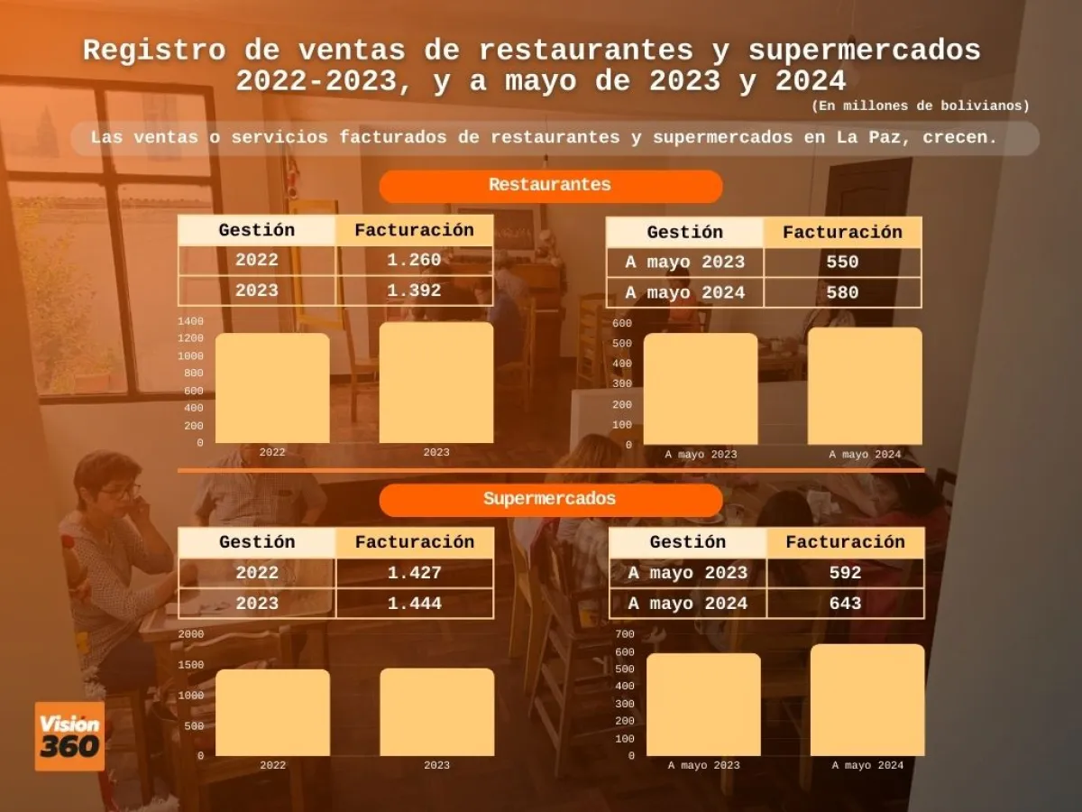 “Las ventas en restaurantes experimentaron un incremento de 94,2%, pasando de 717 millones de bolivianos en 2020, a 1.392 millones de bolivianos en 2023. En 2022, las ventas fueron de 1.260 millones de bolivianos. Asimismo, el crecimiento acumulado de estas ventas al mes de mayo de 2024 alcanzó un 5,4% al pasar de 550 a 580 millones de bolivianos”, destaca esa cartera de Estado.