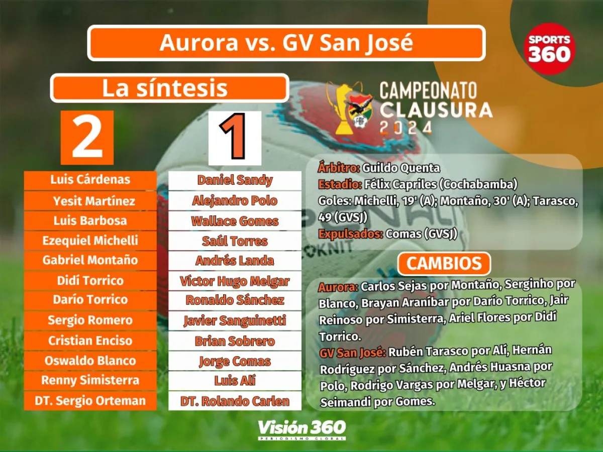 Una equivocación de cálculo en el intento del arquero Daniel Sandy por despejar con los puños la pelota derivó en la apertura del marcador para Aurora. El zaguero Ezequiel Michelli conectó de cabeza para el 1-0 a los 19 minutos.