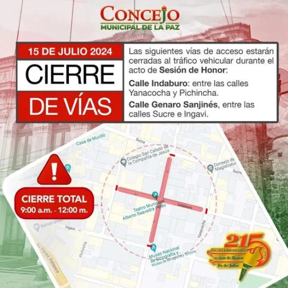 Debido a la sesión de honor, las cuatro calles adyacentes al Teatro Municipal estarán restringidas al tráfico vehicular durante todo el evento. De acuerdo a información brindada por el Concejo Municipal de La Paz, Entre las 09.00 y las 12.00 se cerrará la calle Indaburo, entre Yanacocha y Pichincha, y la calle Genaro Sanjinés, entre Sucre e Ingavi.