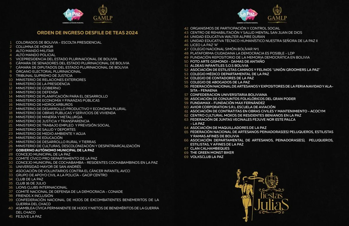 El recorrido empezará por la calle Ingavi, continuará por la esquina Alto de la Alianza, vía Junín, bajará por la lateral de la plaza Murillo, frontis de la Casa Grande del Pueblo y las calles Ayacucho y Mercado, según información de la Secretaría Municipal de Culturas y Turismo. Luego, el desfile proseguirá desde la altura de la calle Colón hasta las avenidas Mariscal Santa Cruz y 16 de Julio. Culminará en la plaza del Estudiante.