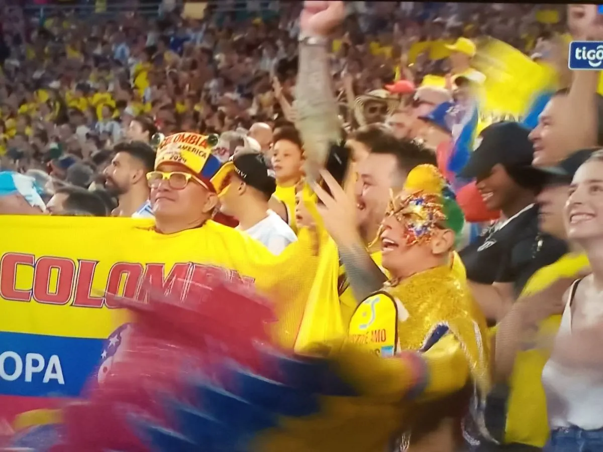 Mientras el estadio hacía gala de las luces que se prendían y apagaban, las pantallas gigantes de la televisión mostraban a hinchas colombianos y argentinos mostrando orgullosos sus casacas.