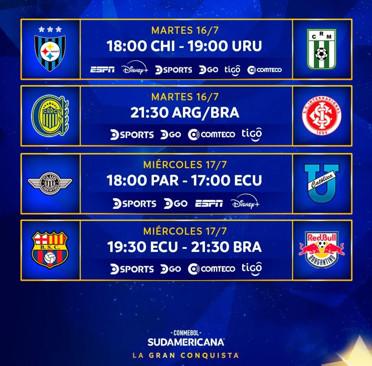 Dos cotejos fueron programados para este martes: el chileno Huachipato recibirá a Racing de Uruguay, mientras que Rosario Central de Argentina será anfitrión de Internacional de Brasil.