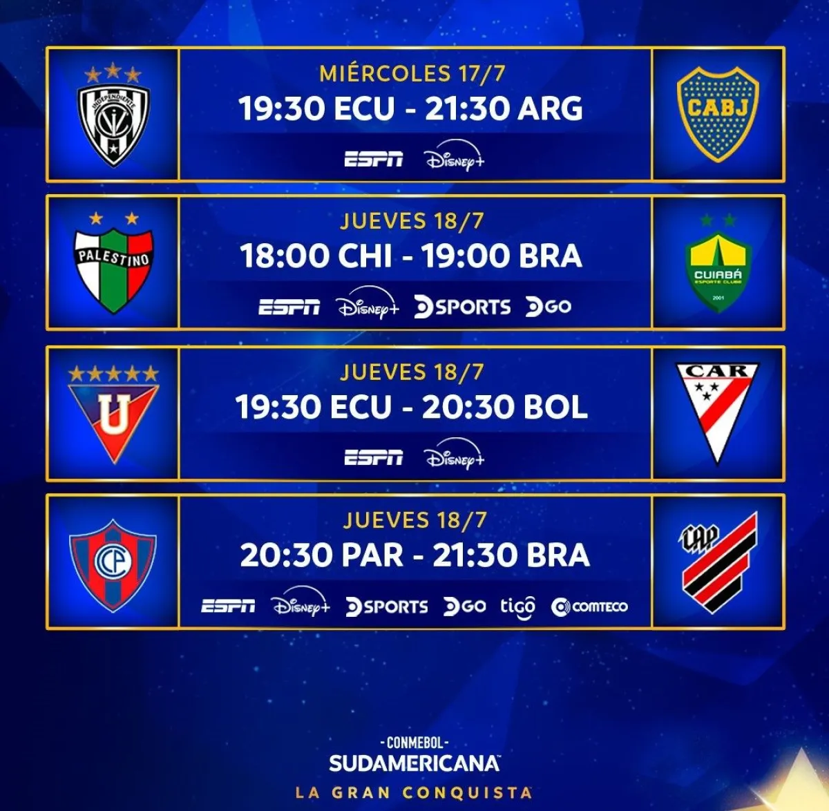 Independiente del Valle de Ecuador recibirá a Boca Juniors y Barcelona de Guayaquil a Red Bull Bragantino de Brasil.