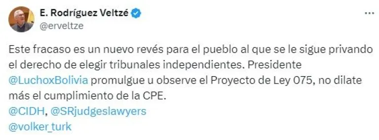 “Este fracaso es un nuevo revés para el pueblo al que se le sigue privando el derecho de elegir tribunales independientes. Presidente Luis Arce, promulgue u observe el Proyecto de Ley 075, no dilate más el cumplimiento de la CPE (Constitución Política del Estado)”, escribió el exmandatario en su cuenta en X.