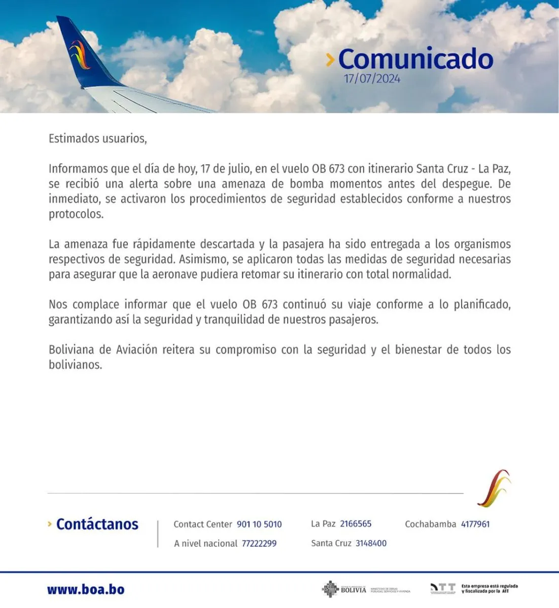 BoA, mediante un comunicado, confirmó que se recibió una alerta de una amenaza de bomba momentos antes del despegue del vuelo, por lo que de inmediato se activaron los procedimientos de seguridad según los protocolos establecidos.
