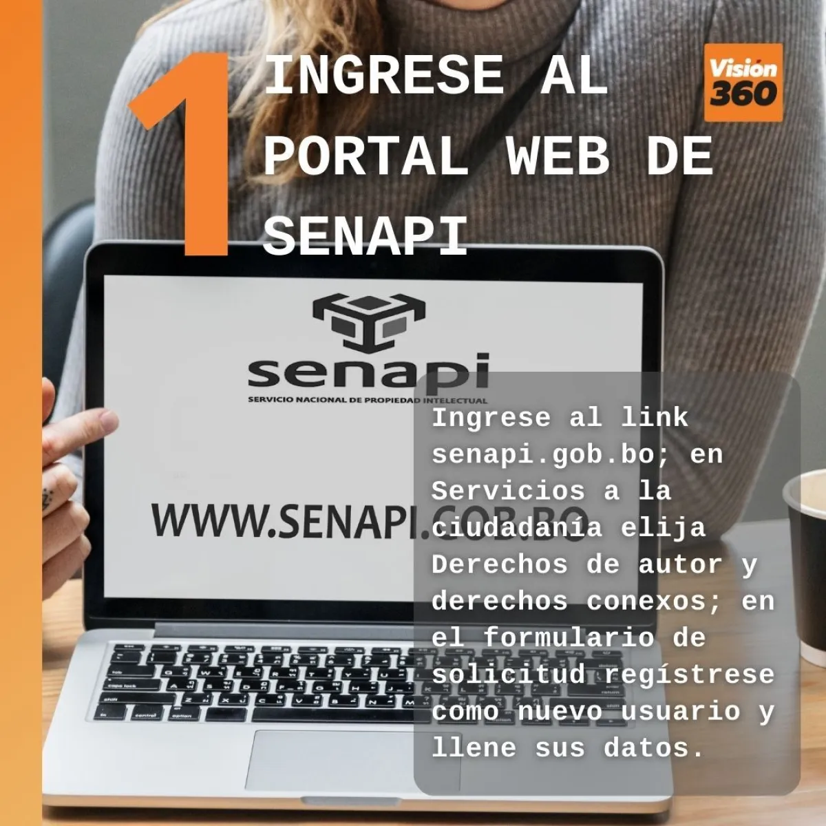 • Ingrese al link senapi.gob.bo; en Servicios a la ciudadanía elija Derechos de autor y derechos conexos; en el formulario de solicitud regístrese como nuevo usuario y llene sus datos.