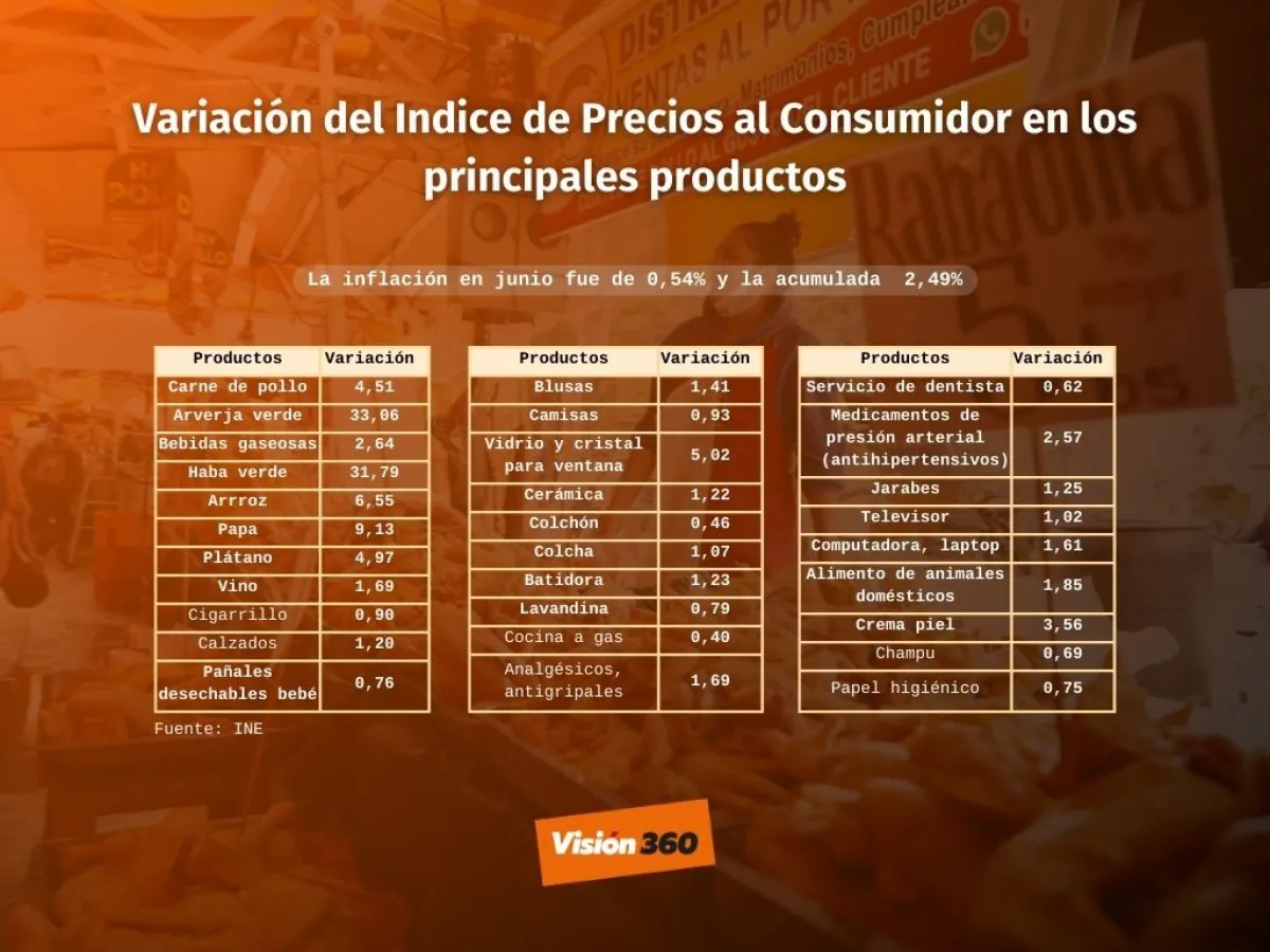En junio del 2024, el índice de precios al consumidor (IPC) registró una variación positiva de 0,54% respecto a mayo, y la variación acumulada a junio fue de 2,49%, informó la anterior semana el Instituto Nacional de Estadística (INE).