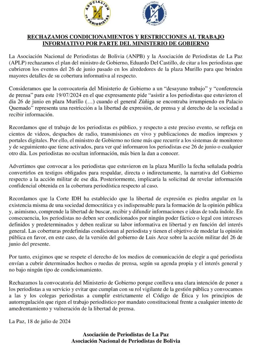La ANPB y la APLP consideraron que "convocar a los periodistas que estuvieron en la plaza Murillo la fecha señalada podría convertirlos en testigos obligados para respaldar, directa o indirectamente, la narrativa del Gobierno respecto a la acción militar de ese día. Posteriormente, implicaría la solicitud de revelar información confidencial obtenida en la cobertura periodística respecto al caso".