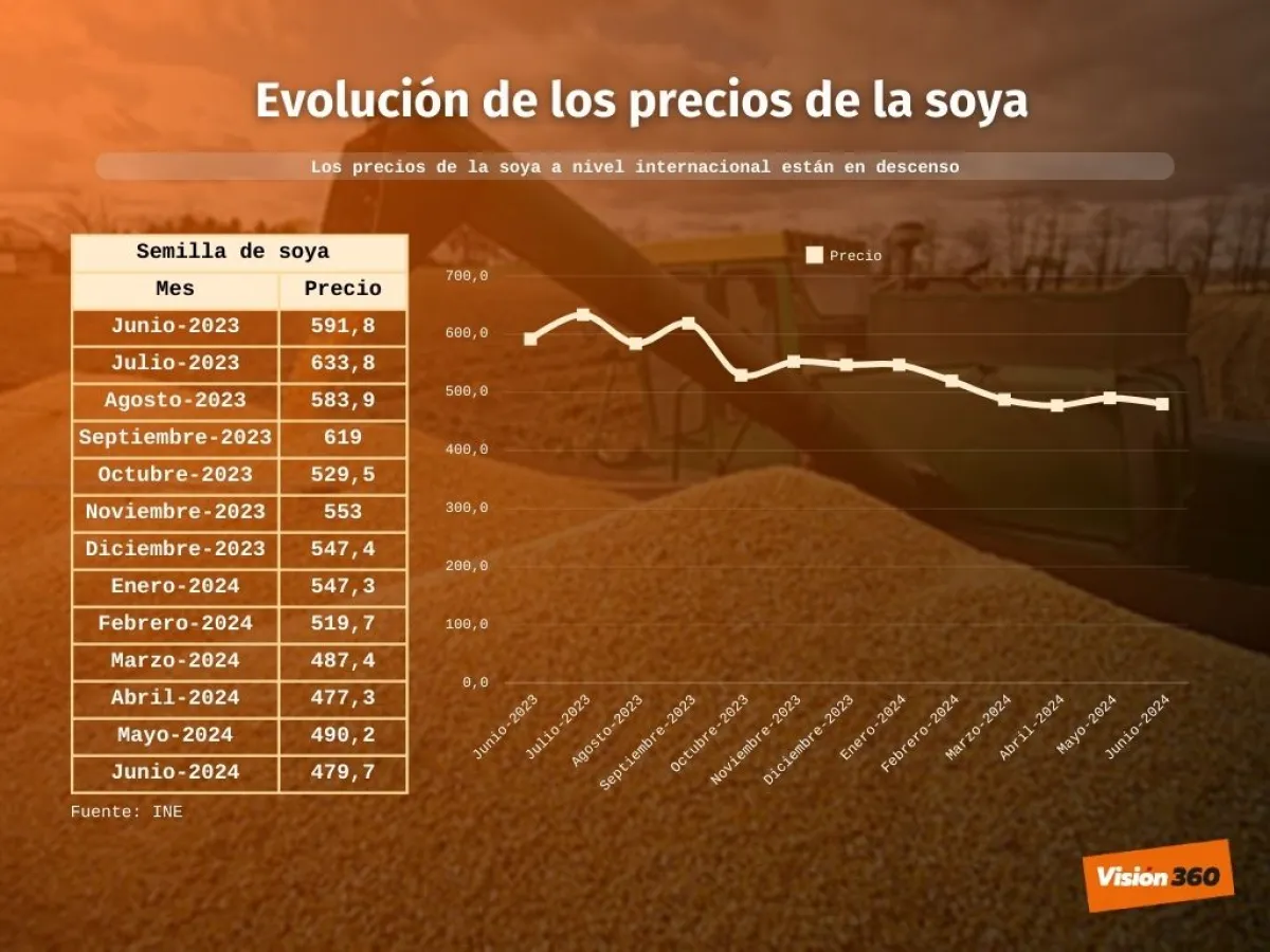 El grano de soya en el mercado cayó el 18 de julio a 403 dólares la tonelada, inferior a los 568 dólares que se tenían hace un año, en julio de 2023, según revelan los datos procesados por el Ministerio de Desarrollo Productivo y el Instituto Nacional de Estadística (INE).