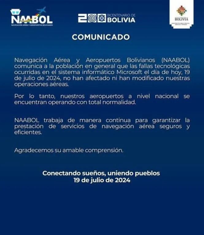 Navegación Aérea y Aeropuertos Bolivianos (Naabol), emitió este viernes un comunicado en el que sostiene que las fallas tecnológicas del sistema informático Microsoft sucedidas este viernes no han afectado las operaciones aéreas en el país, por lo que las actividades en todos los aeropuertos son normales.