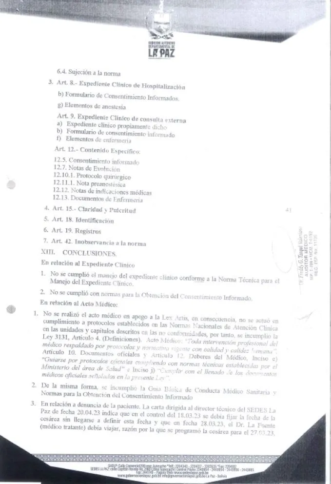 Entre las conclusiones se lee: “No se realizó el acto médico en apego a la Lex Artis (Conjunto de reglas técnicas a que ha de ajustarse la actuación de un profesional en ejercicio de su arte u oficio); en consecuencia, no se actuó en cumplimiento a protocolos establecidos en las Normas Nacionales de atención Clínica en las unidades y capítulos descritos en las no conformidades; por tanto, se incumplió la Ley 3131 (Ley de Ejercicio Profesional Médico), artículo 4”.