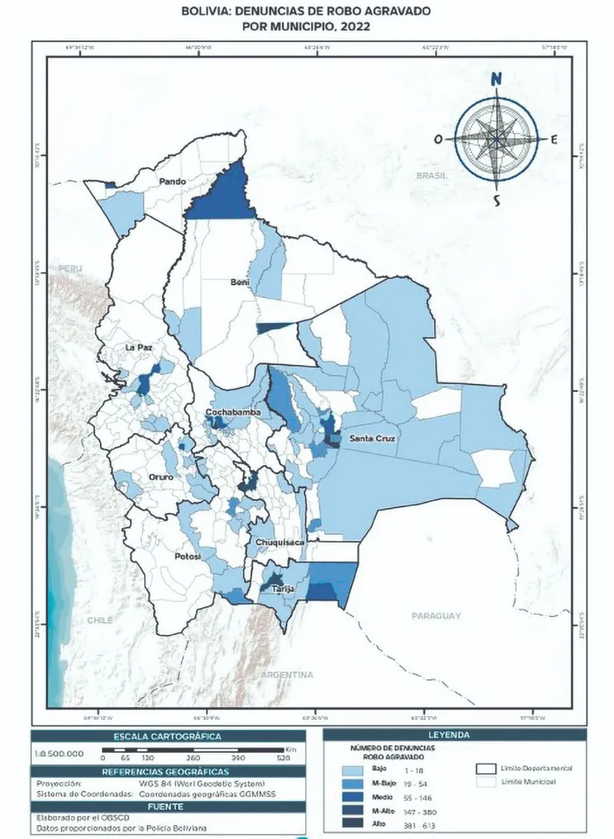 Según el Atlas de Seguridad Ciudadana del Ministerio de  Gobierno, en el municipio de La Paz, en 2022 (última cifra disponible), se recibieron 143 denuncias de robo agravado, mientras que en El Alto fueron 202. El 44,23% de las víctimas son mujeres.
