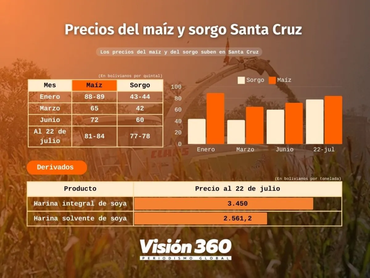 El presidente de la Federación Nacional de Avicultores manifestó que el precio del grano de maíz hace unos tres meses estaba entre 52 y 55 bolivianos el quintal, pero ahora se cotiza en 81 y 82 bolivianos, y aseguró que el sorgo ya no se encuentra en el mercado.