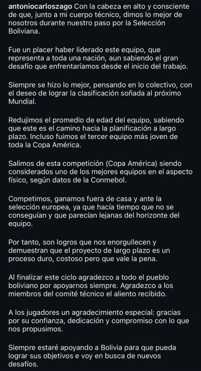 Escribió que se va con la cabeza en alto porque junto a su cuerpo técnico “dimos lo mejor de nosotros durante nuestro paso por la selección boliviana”.