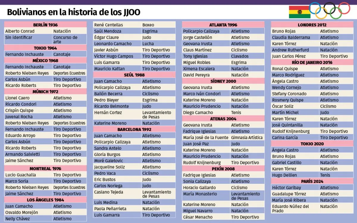 A lo largo de las 16 ediciones de JJOO en las que estuvo Bolivia —incluyendo París 2024— participaron 82 deportistas en 14 disciplinas: natación, canotaje, deportes ecuestres, tiro deportivo, atletismo, ciclismo, boxeo, esgrima, judo, lucha, levantamiento de pesas, clavados, tenis y gimnasia artística.
