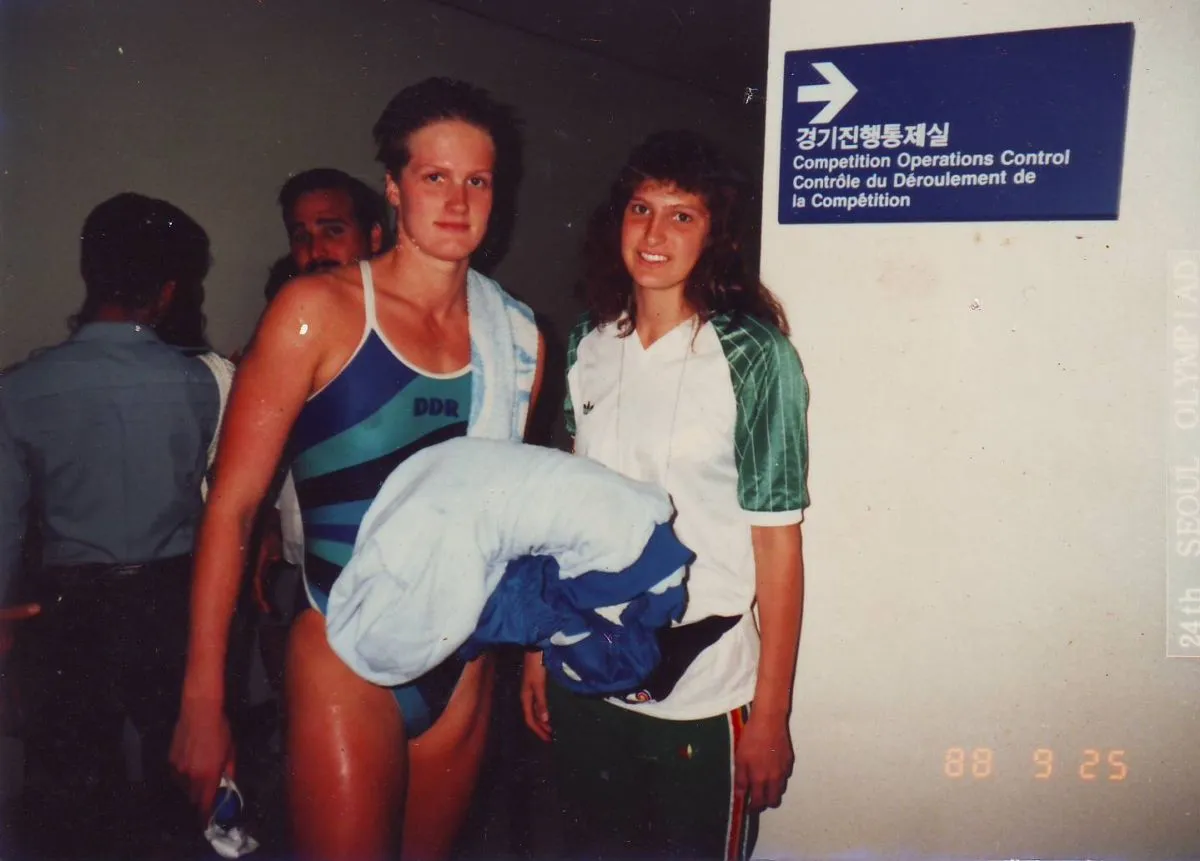 Moreno (der.) junto a la nadadora alemana Kristin Otto, de las mejores de la historia, en Seúl 1988. Foto: Katerine Moreno.