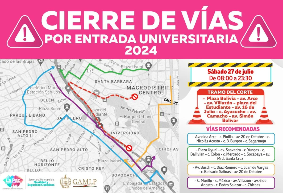 Un aspecto importante es el cambio de ruta que se adoptó debido a los trabajos que se realizan en la bóveda del río Choqueyapu, en el sector de San Francisco. Es así que este año, la entrada partirá de la plaza Bolivia, seguirá por la avenida Arce, llegará a la plaza del Estudiante y proseguirá por El Prado, tomará la avenida Camacho hasta la Simón Bolívar y concluirá en la plaza del Estadio.