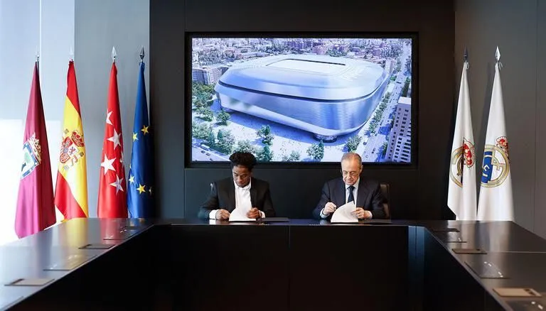 Endrick y Florentino Pérez firman el contrato por seis temporadas. Foto: Real Madrid