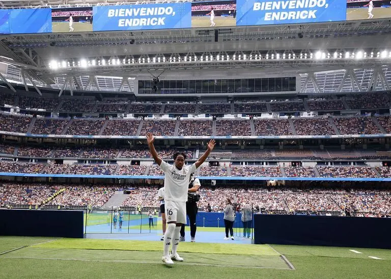 Endrick culminó sus palabras animando a los presentes a decir "Un, dos, tres; Hala Madrid" y posteriormente procedió a besar el escudo de la camiseta en varias ocasiones y a repartir balones entre las decenas de miles de aficionados, algunos de ellos con camisetas del Real Madrid o de la selección brasileña, que se dieron cita en el escenario.