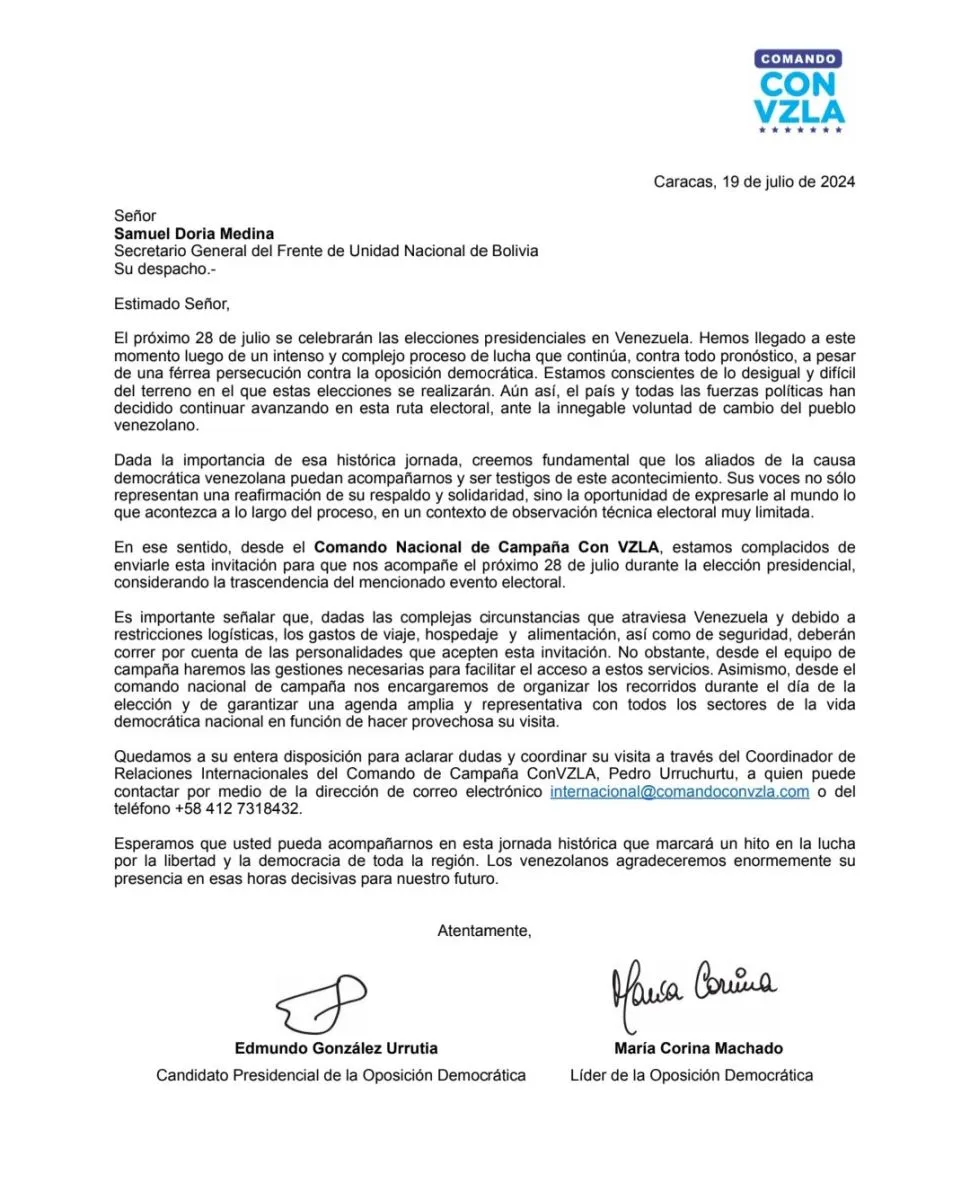 El empresario y político de oposición Samuel Doria Medina fue echado de Venezuela donde llegó como invitado de María Corina Machado, líder de la oposición democrática en ese país, para ser veedor de los comicios que se verificarán mañana, domingo.