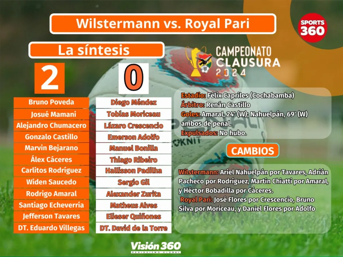 Wilstermann obtuvo este sábado su primer triunfo con Eduardo Villegas en el mando técnico, al derrotar 2-0 a Royal Pari en el estadio Félix Capriles con dos goles de penal, por la séptima jornada del Torneo Apertura de la División Profesional.