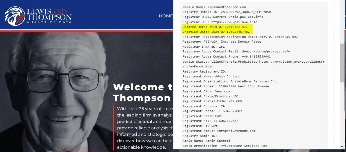 Adicionalmente, el equipo de prensa de Bolivia Verifica detectó que la web lewisandthompson.com, además de haber sido creada el 10 de julio, fue actualizada el 27 y es un dominio que fue comprado hasta el 10 de julio de 2025.