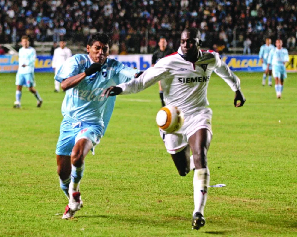 Roger Suárez (izq.) en el partido con Liga de Quito. Foto: Historia del Fútbol Boliviano.