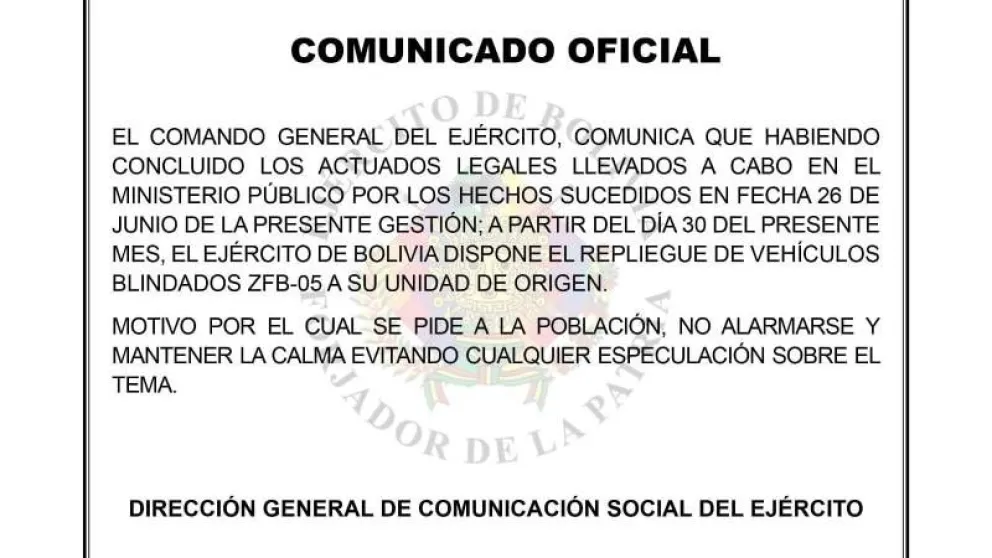 “El Comando General del Ejército comunica que, habiendo concluido los actuados legales llevados a cabo en el Ministerio Público por los hechos sucedidos en fecha 26 de junio de la presente gestión, a partir del día 30 del presente mes, el Ejército de Bolivia dispone el repliegue de vehículos blindados ZFB-05 a su unidad de origen”, indica el comunicado del Ejército.