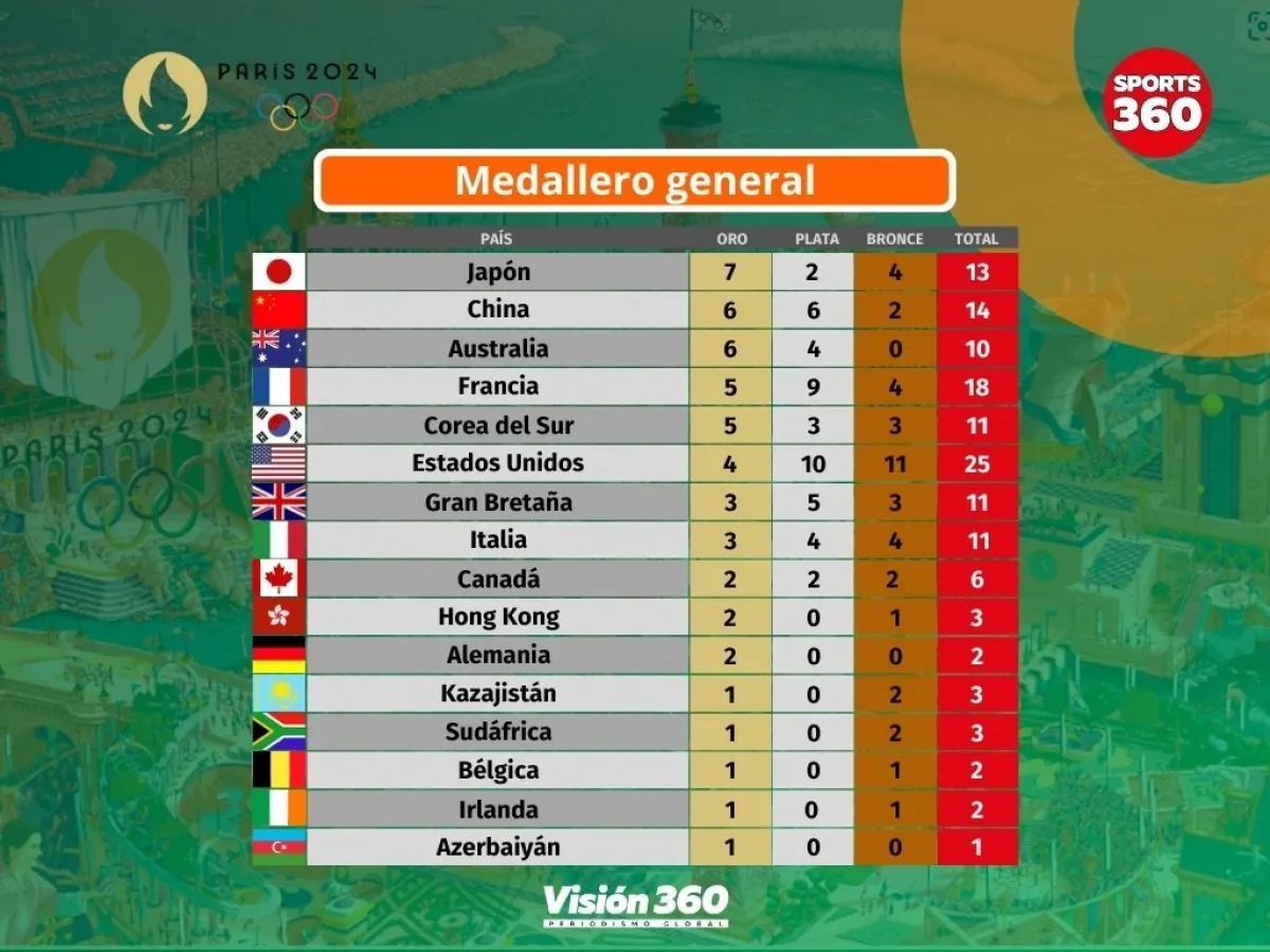 Japón aparece una vez más en cabeza del medallero de los Juegos Olímpicos de París 2024 por delante de China y de Australia, a los que aventaja en tan solo un oro.