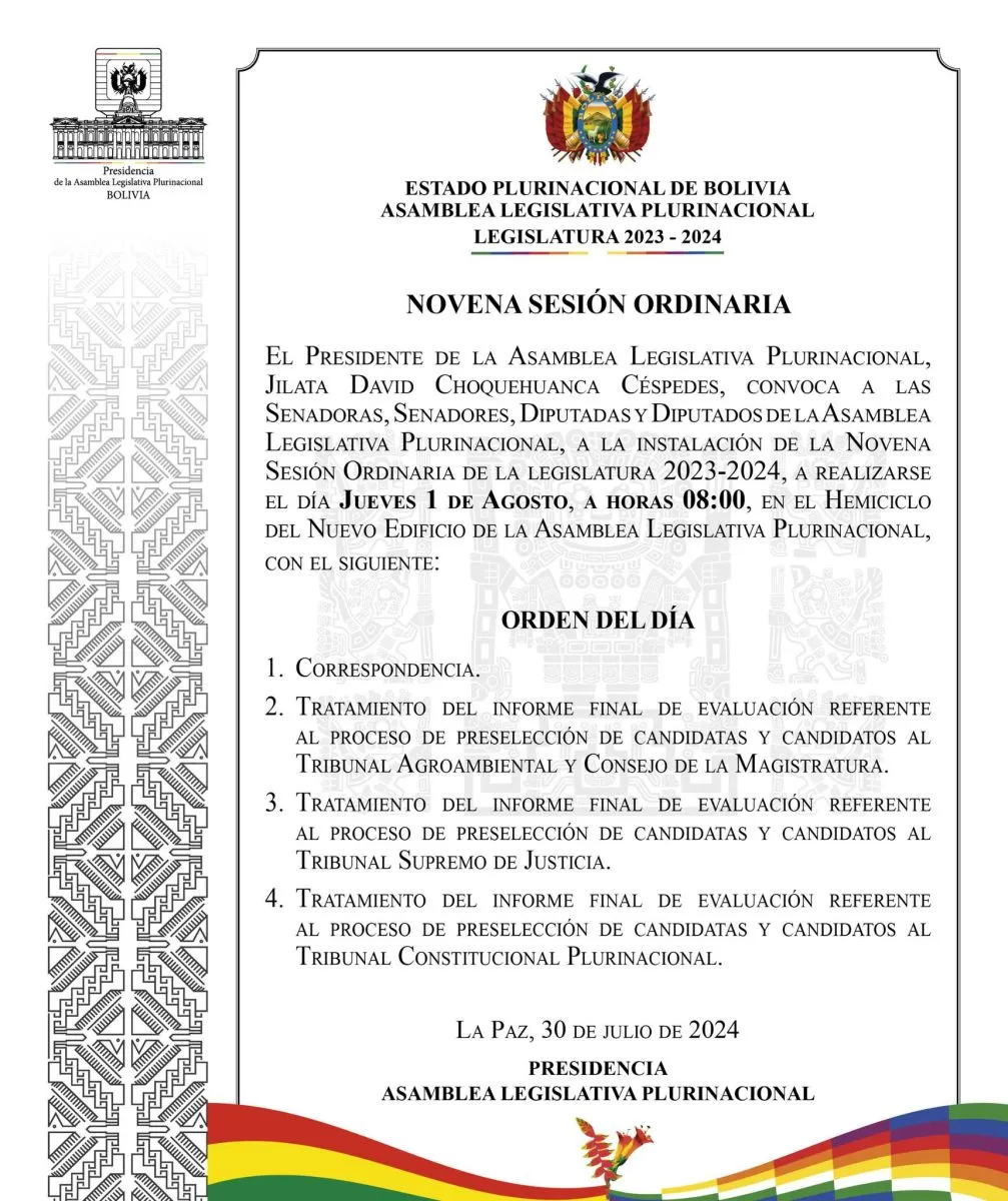 “El presidente de la Asamblea Legislativa Plurinacional, David Choquehuanca, convoca a las senadoras, senadores, diputadas y diputados de la Asamblea Legislativa Plurinacional a la instalación de la novena sesión ordinaria de la legislatura 2023-2024, a realizarse el día jueves 1 de agosto, a horas 08h00, en el hemiciclo del nuevo edificio de la Asamblea Legislativa Plurinacional”, establece la convocatoria que fue publicada esta jornada.